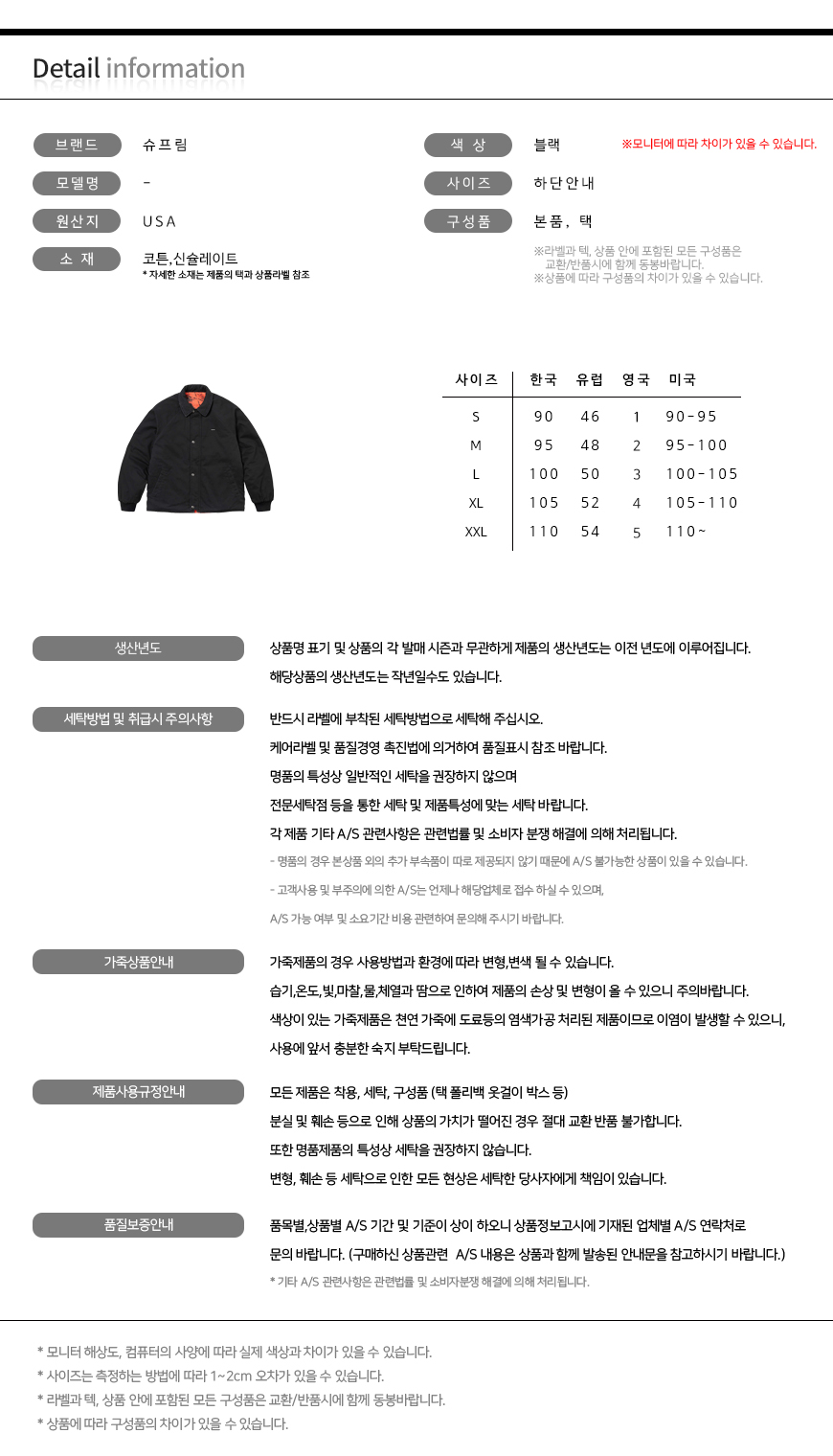 | 세탁방법 및 취급시 주의사항 | 제품의 수명을 연장시키기 위하여 제품에 부착되어 있는 제품 특성 및 세탁 방법을 반드시 확인하여 주시기 바랍니다. |