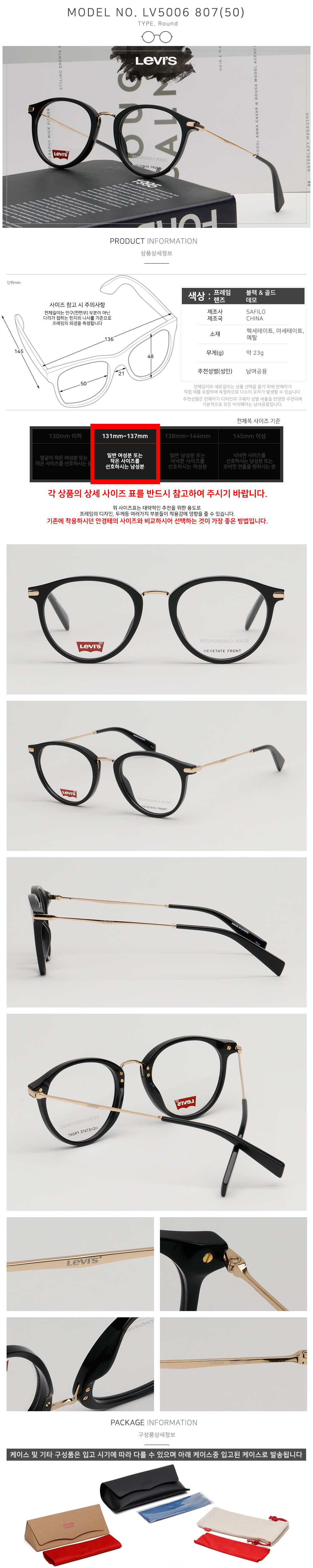 | 치수 | 전체길이(테포함)/렌즈가로/렌즈세로(테포함)/코간격/다리길이: 136/50/48/21/145 (mm)기준 테포함사이즈는 실측하는 부분으로 오차가 있을 수 있습니다 |