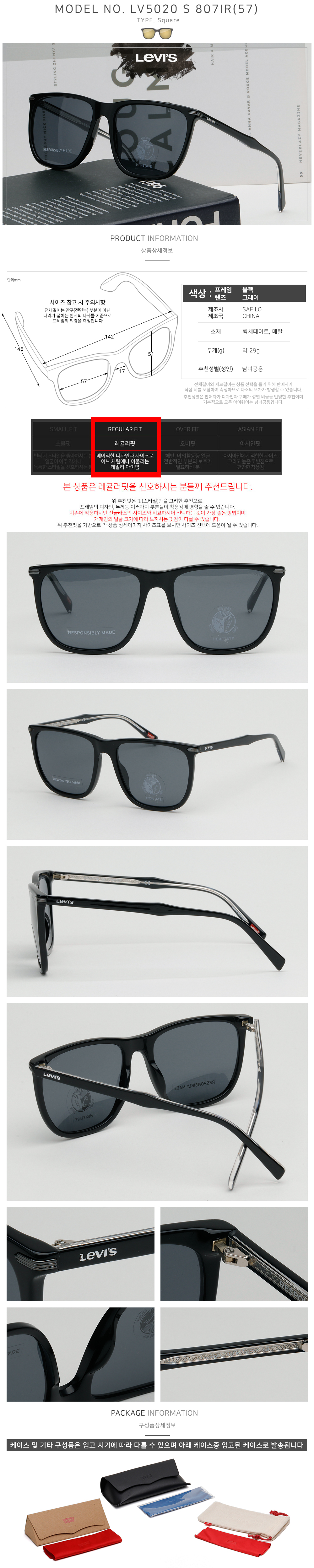 | 치수 | 전체길이(테포함)/렌즈가로/렌즈세로(테포함)/코간격/다리길이: 142/57/51/17/145 (mm)기준 테포함사이즈는 실측하는 부분으로 오차가 있을 수 있습니다 |