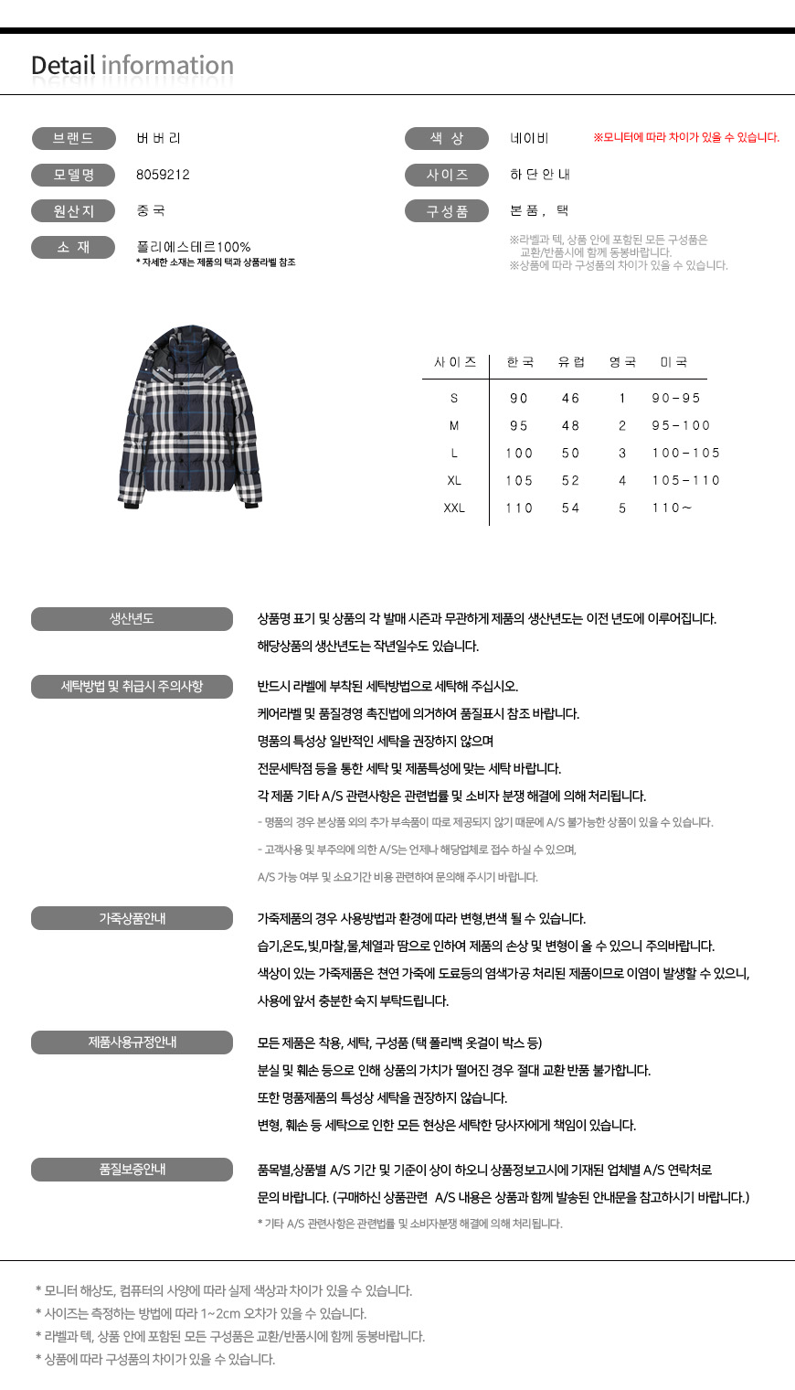 | 세탁방법 및 취급시 주의사항 | 제품의 수명을 연장시키기 위하여 제품에 부착되어 있는 제품 특성 및 세탁 방법을 반드시 확인하여 주시기 바랍니다. |