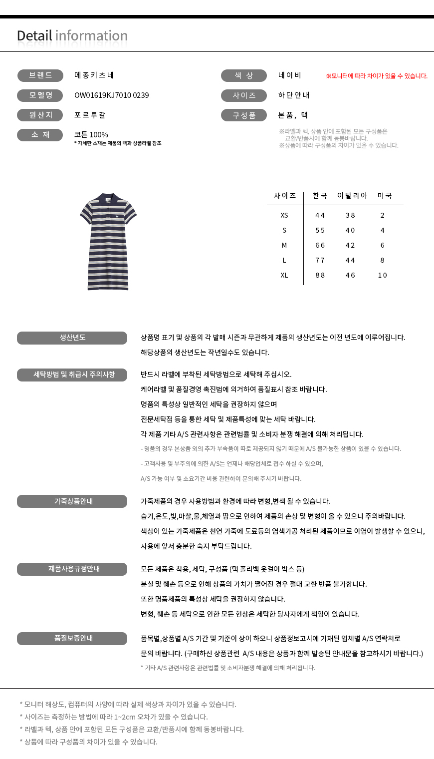 | 세탁방법 및 취급시 주의사항 | 제품의 수명을 연장시키기 위하여 제품에 부착되어 있는 제품 특성 및 세탁 방법을 반드시 확인하여 주시기 바랍니다. |