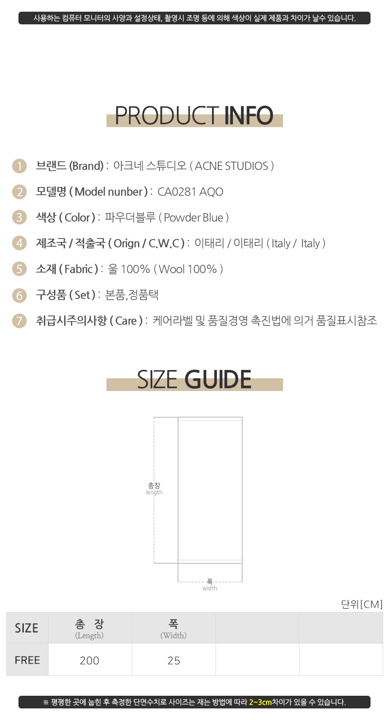 디몬트 23 F/W 아크네 스튜디오 공용 핑크라벨 슬림 울 머플러(파우더블루) CA0281 AQO